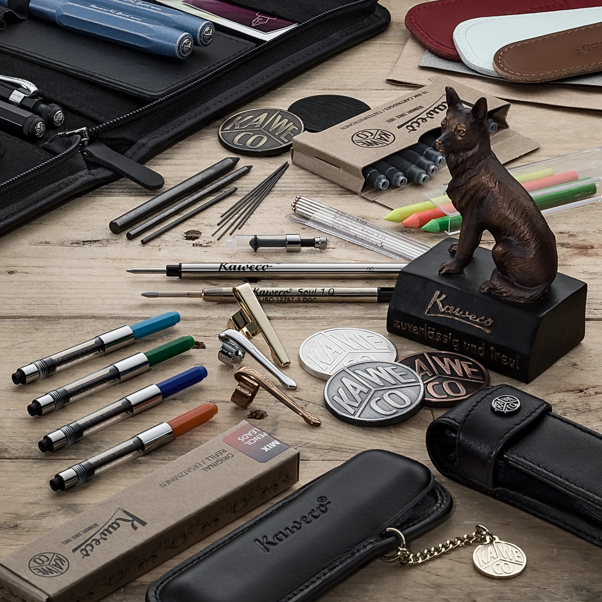 Die Kaweco Ersatz Bleistiftminen bestehen aus Graphit und sind erhältlich in 0.3, 0.5, 0.7, 0.9, 1.18 und 2.0 mm im Härtegrad HB (in Europa mittlerer Härtegrad). Die Minen für die Kaweco Fallbleistifte sind erhältlich in 3.2 und 5.6 mm im Härtegrad 5B. Sie sind also besonders weich und so perfekt zum Zeichnen geeignet.