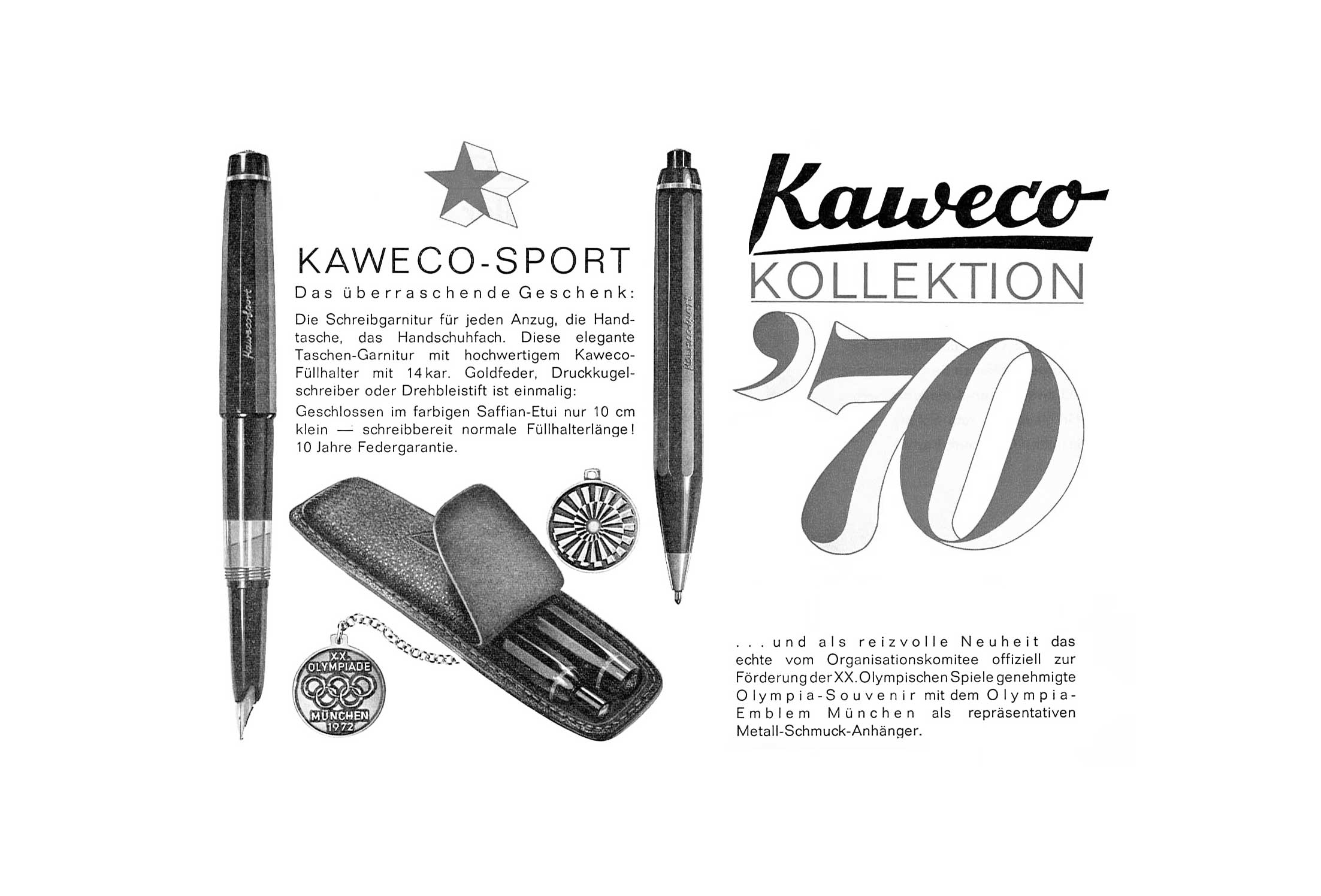 Kaweco erwirbt Lizenz für die XX. Olympischen Spiele und bringt Sport Garnitur mit speziellem Schmuck. Viele Versicherungen lieben Kaweco Sport als Werbeträger.