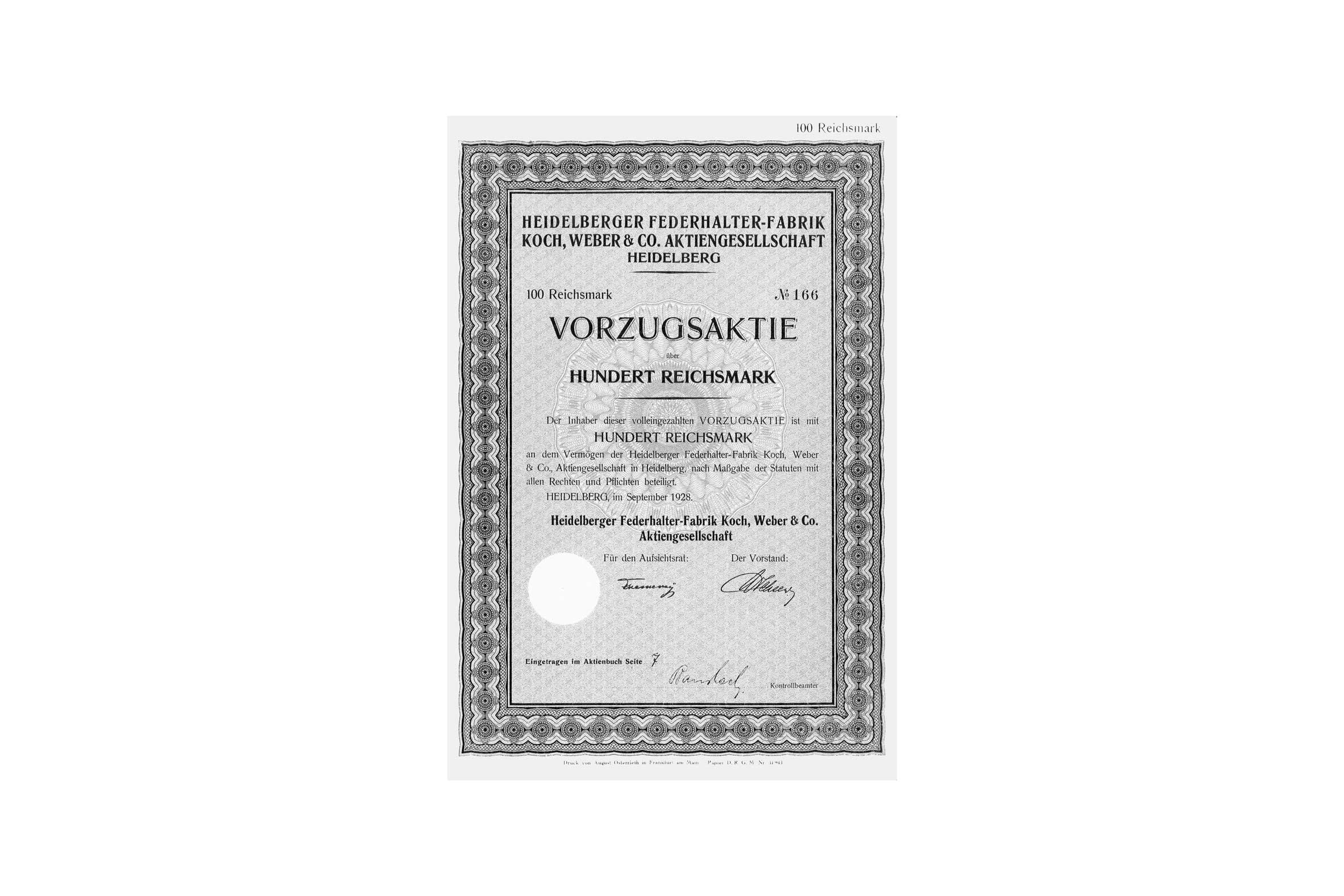 Übernahme der Heidelberger Federhalterfabrik durch die Herren Heinrich Koch und Rudolph Weber und Aufbau einer neuen Produktion in Handschuhsheim, außerhalb Heidelbergs. Produkte werden mit Markennamen Perkeo, Omega und Kaweco versehen und tragen zusätzlich das Zeichen „HF“ für Heidelberger Federhalterfabrik.
