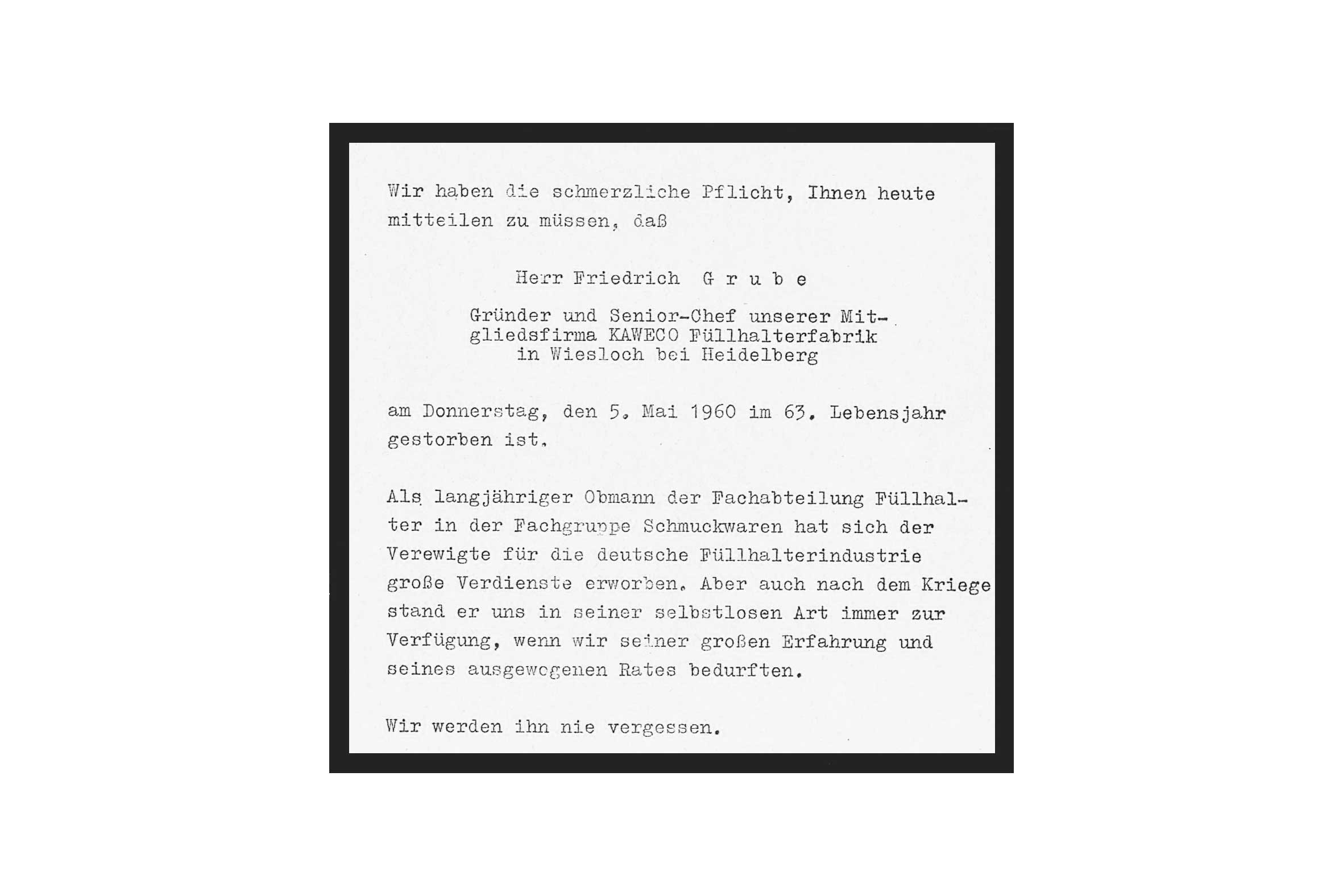 Herr Friedrich Grube Senior stirbt am 05.05.1960. Sein Sohn Wilhelm, dessen Frau Liselotte und ihre beiden Söhne führen den Betrieb fort. Die Produktpalette wird dem Zeitgeschmack entsprechend stromlinienförmig gestaltet. Die Federn sind zum Teil verdeckt.