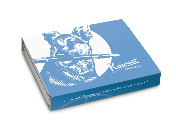 Der hübsche Schuber spiegelt die 50er und 60er Jahre wider. Mit einem blau-weißen Aufdruck des Kaweco Schäferhundes wird jede Geschenkebox zum Schmuckstück.